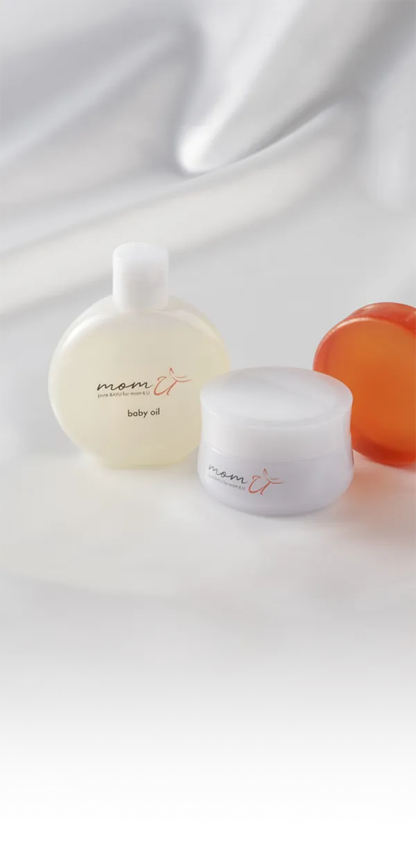 momUベビーオイル・momUクリームはオイル成分として馬油のみを使用した製品です。品質の良い馬油のみを厳選し使用していますので、肌が弱い方にも使っていただける製品となっています。